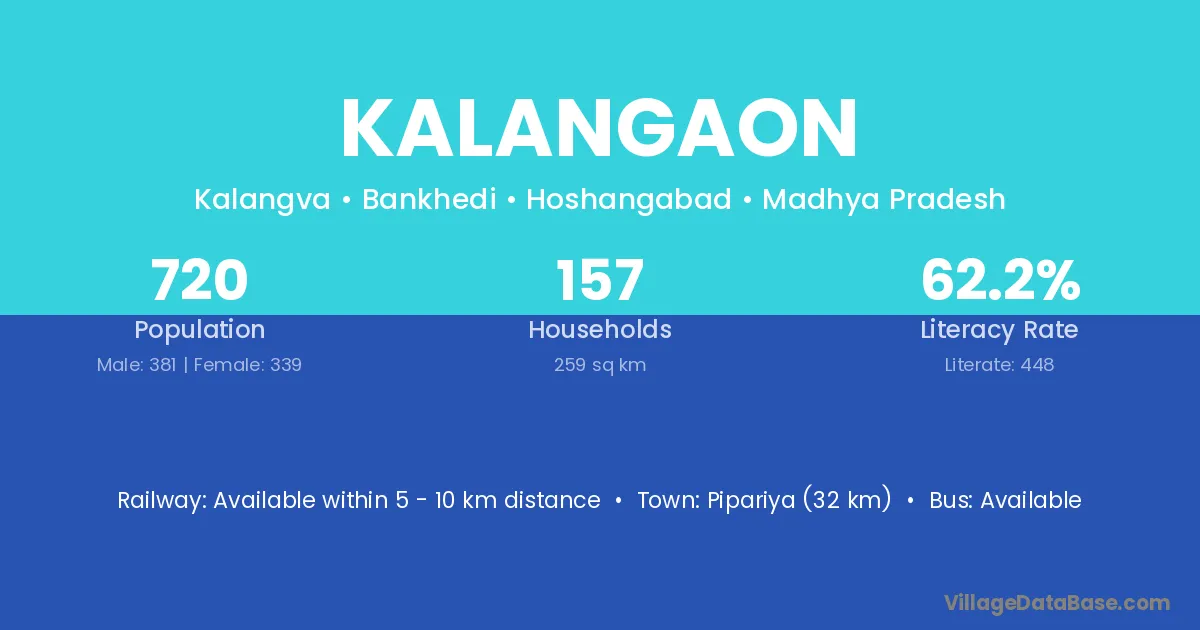Pipariya (32 km) is the nearest town to Kalangaon village for major economic activities and is located approximately 32 km away.