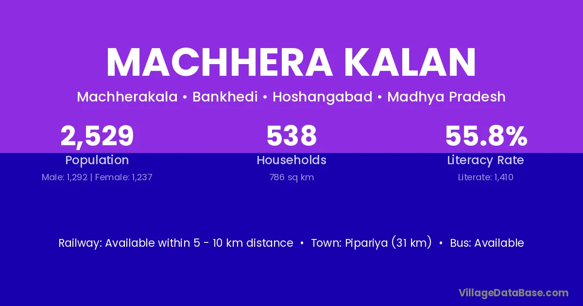 Pipariya (31 km) is the nearest town to Machhera Kalan village for major economic activities and is located approximately 31 km away.