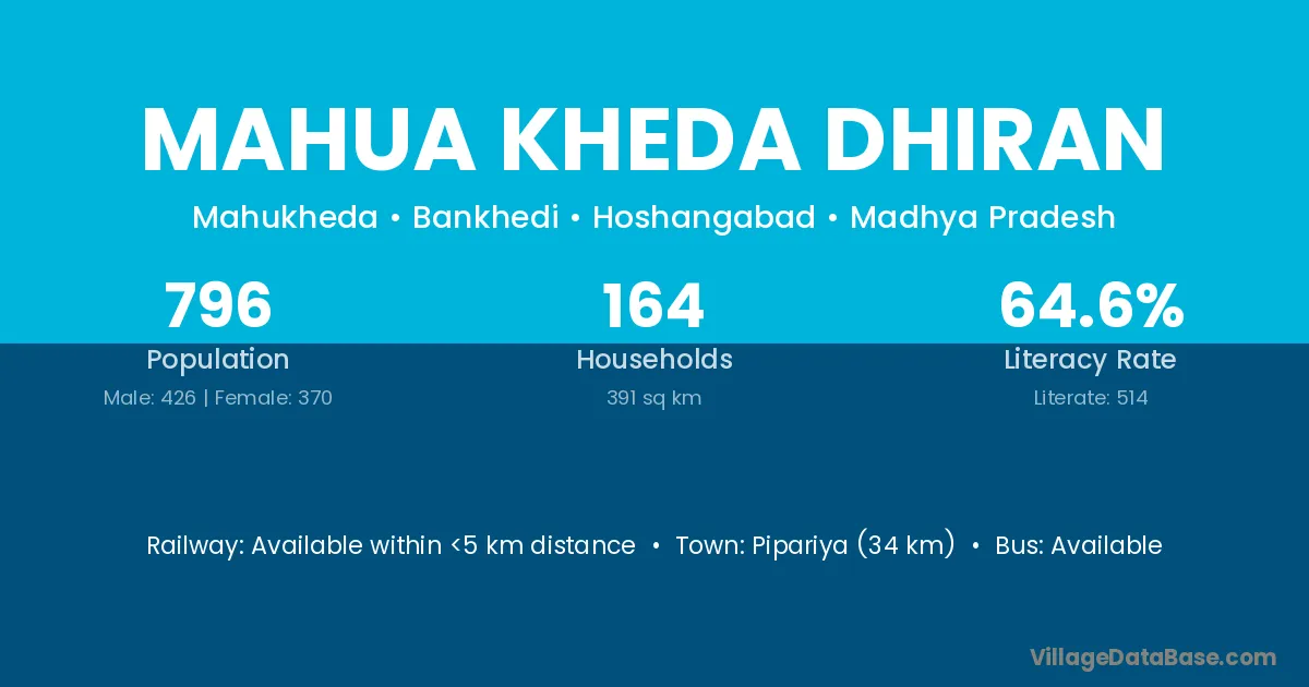 Pipariya (34 km) is the nearest town to Mahua Kheda Dhiran village for major economic activities and is located approximately 34 km away.