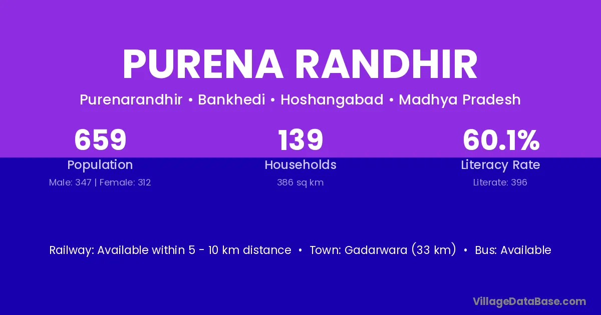 Gadarwara (33 km) is the nearest town to Purena Randhir village for major economic activities and is located approximately 33 km away.