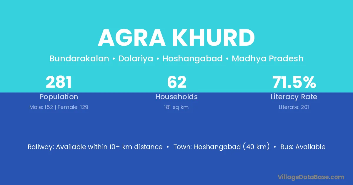 Hoshangabad (40 km) is the nearest town to Agra Khurd village for major economic activities and is located approximately 40 km away.