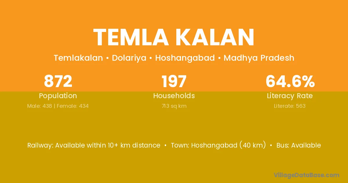 Hoshangabad (40 km) is the nearest town to Temla Kalan village for major economic activities and is located approximately 40 km away.