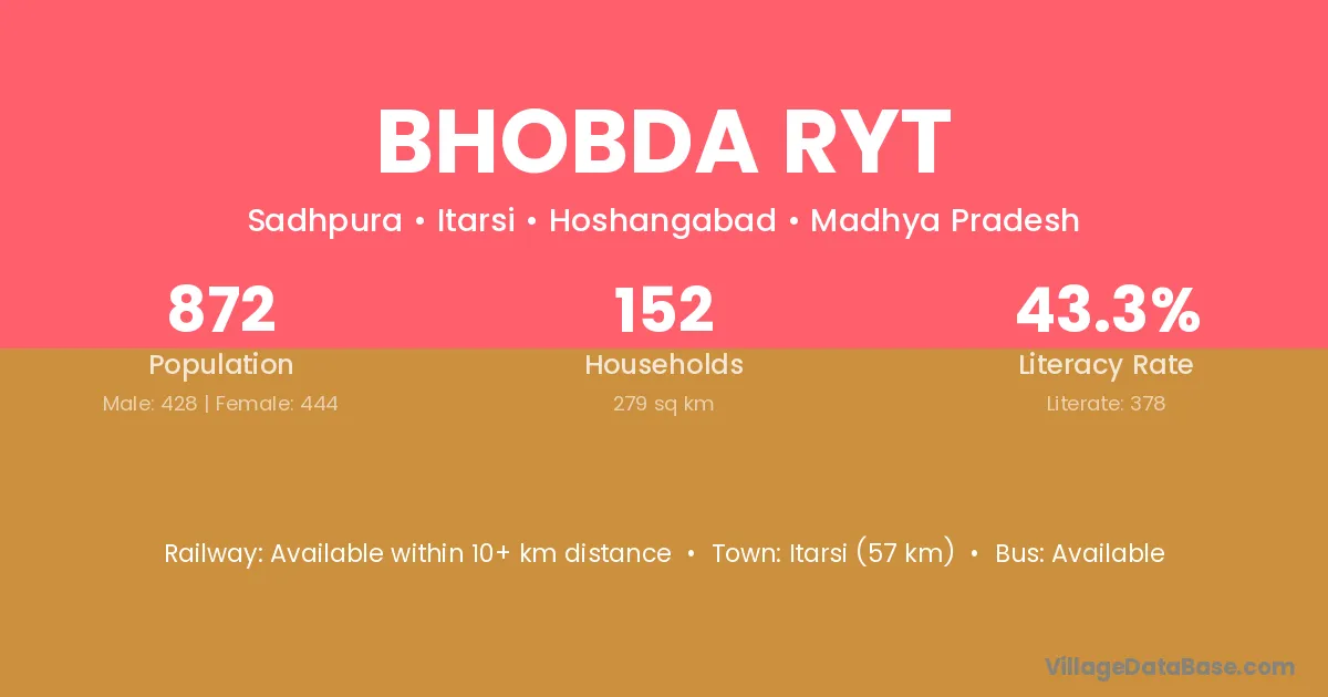 Itarsi (57 km) is the nearest town to Bhobda Ryt village for major economic activities and is located approximately 57 km away.