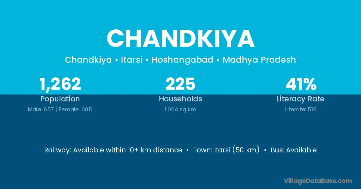 Itarsi (50 km) is the nearest town to Chandkiya village for major economic activities and is located approximately 50 km away.