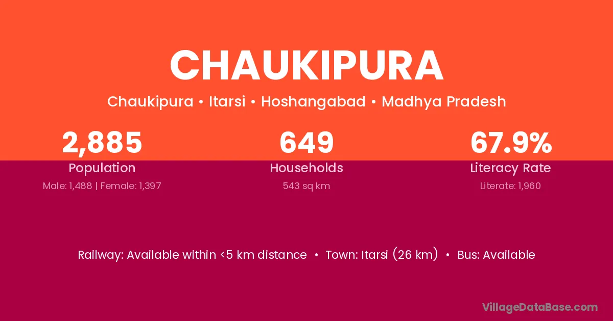 Itarsi (26 km) is the nearest town to Chaukipura village for major economic activities and is located approximately 26 km away.