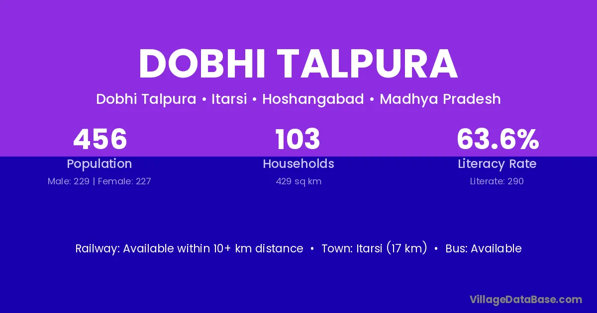 Itarsi (17 km) is the nearest town to Dobhi Talpura village for major economic activities and is located approximately 17 km away.