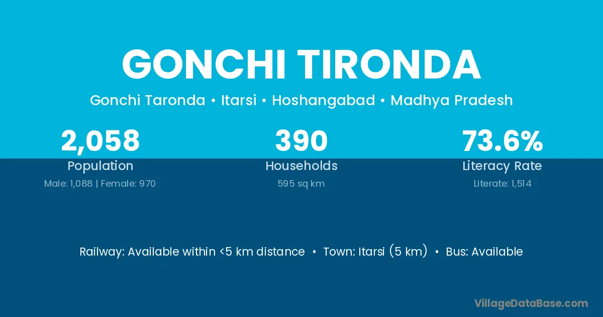 Itarsi (5 km) is the nearest town to Gonchi Tironda village for major economic activities and is located approximately 5 km away.