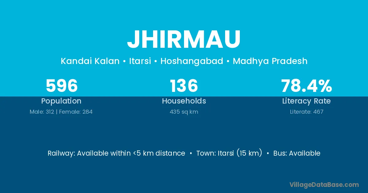 Itarsi (15 km) is the nearest town to Jhirmau village for major economic activities and is located approximately 15 km away.