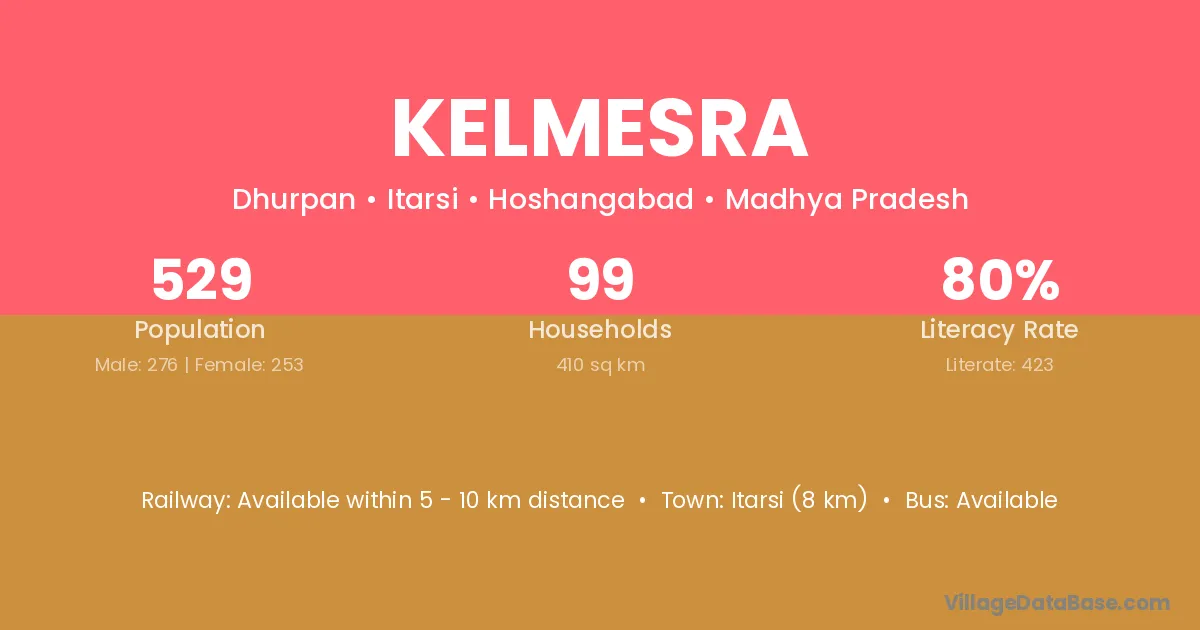 Itarsi (8 km) is the nearest town to Kelmesra village for major economic activities and is located approximately 8 km away.
