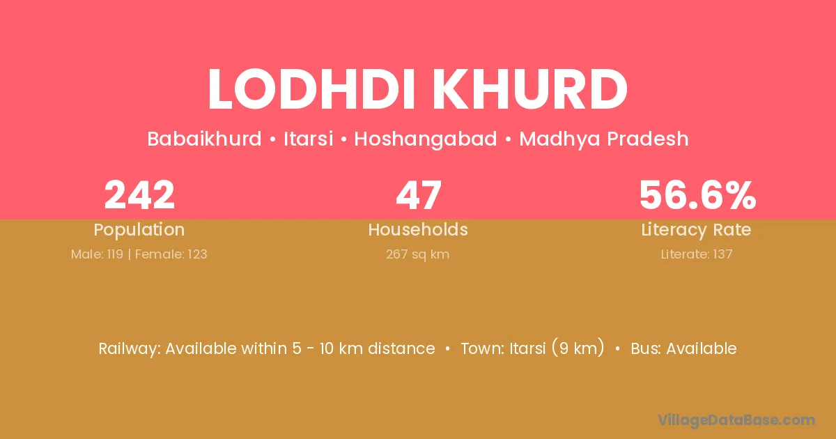 Itarsi (9 km) is the nearest town to Lodhdi Khurd village for major economic activities and is located approximately 9 km away.