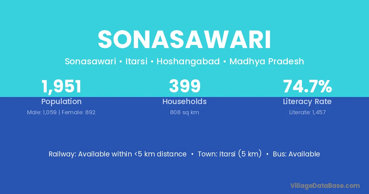 Itarsi (5 km) is the nearest town to Sonasawari village for major economic activities and is located approximately 5 km away.