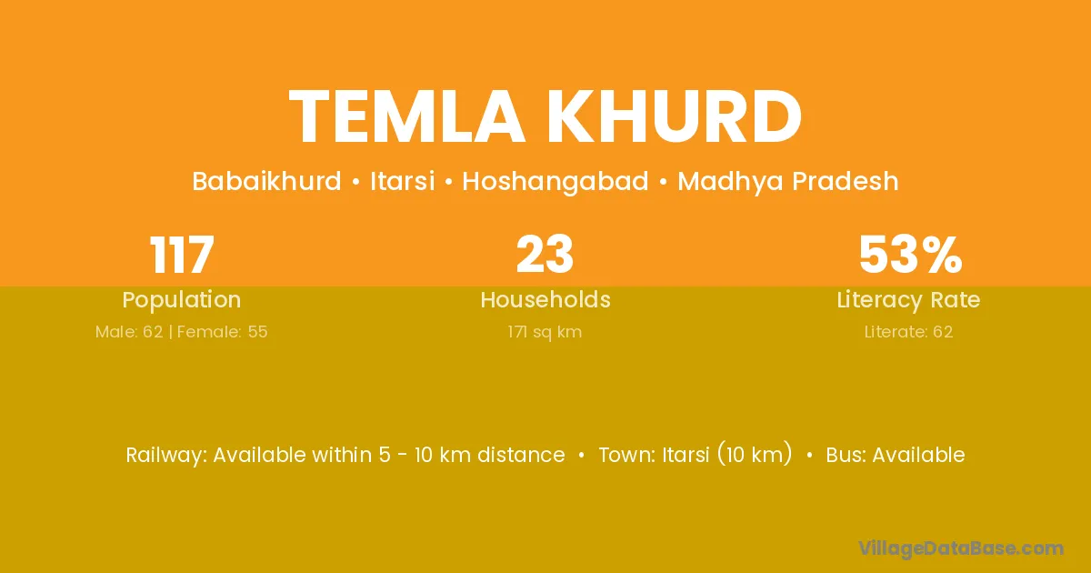 Itarsi (10 km) is the nearest town to Temla Khurd village for major economic activities and is located approximately 10 km away.