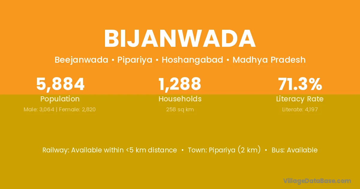 Pipariya (2 km) is the nearest town to Bijanwada village for major economic activities and is located approximately 2 km away.