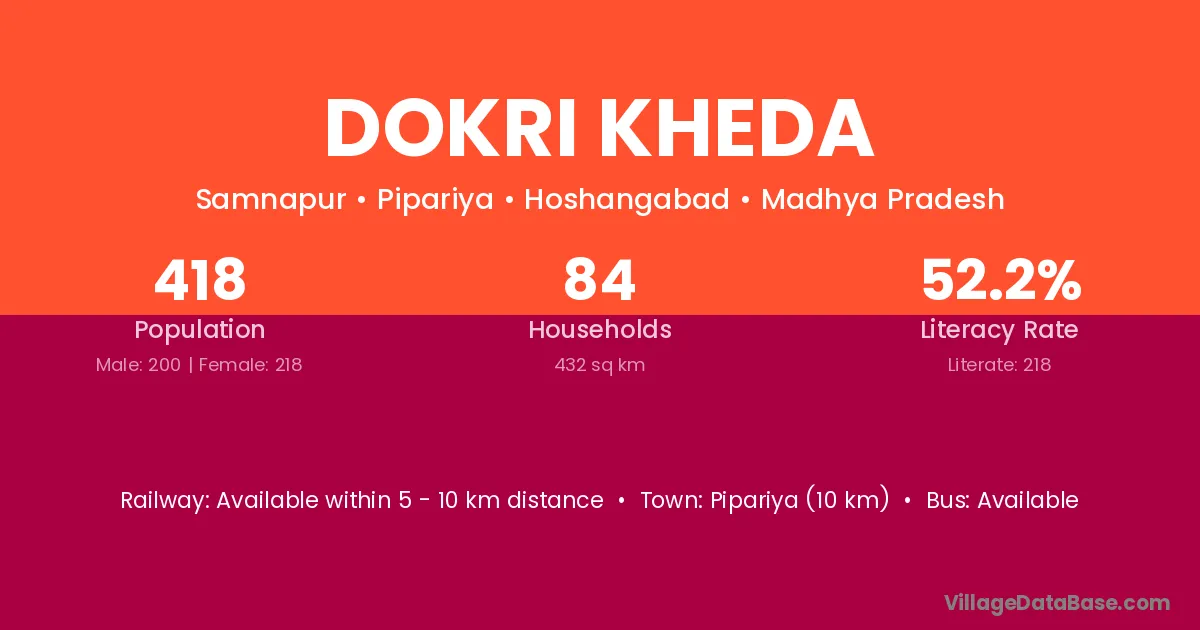 Dokri Kheda village has a total population of 418 people, of which 200 are males and 218 are females.