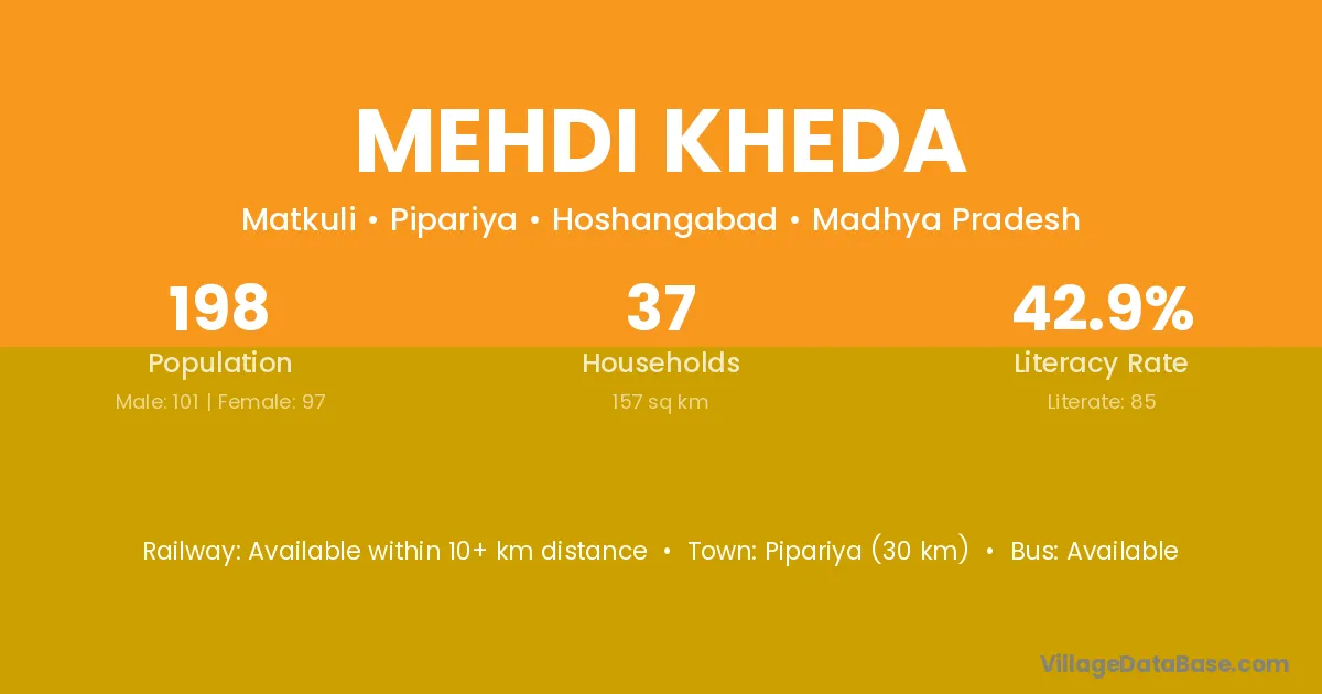 Pipariya (30 km) is the nearest town to Mehdi Kheda village for major economic activities and is located approximately 30 km away.