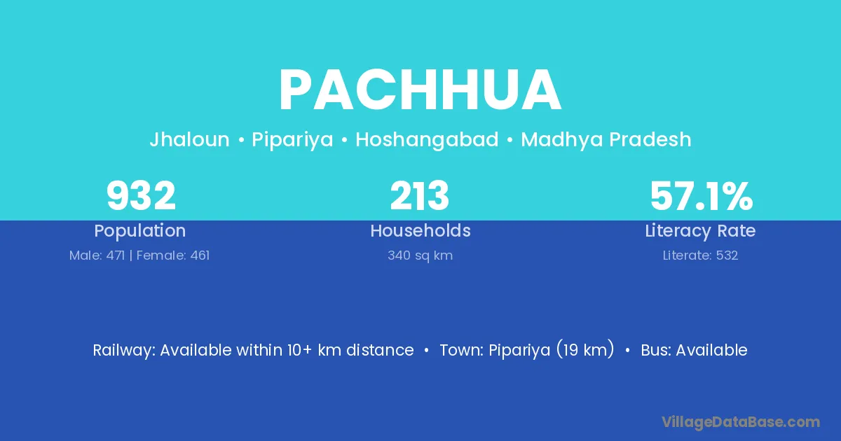 Pipariya (19 km) is the nearest town to Pachhua village for major economic activities and is located approximately 19 km away.