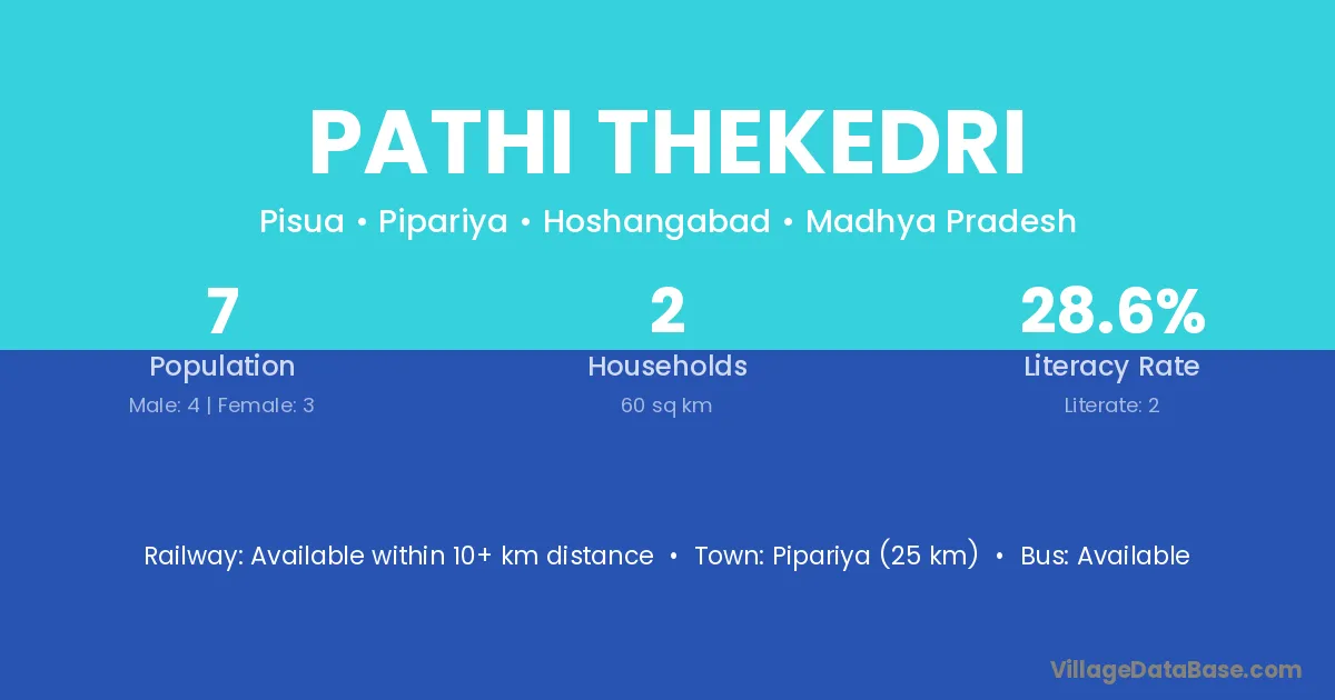 Pipariya (25 km) is the nearest town to Pathi Thekedri village for major economic activities and is located approximately 25 km away.