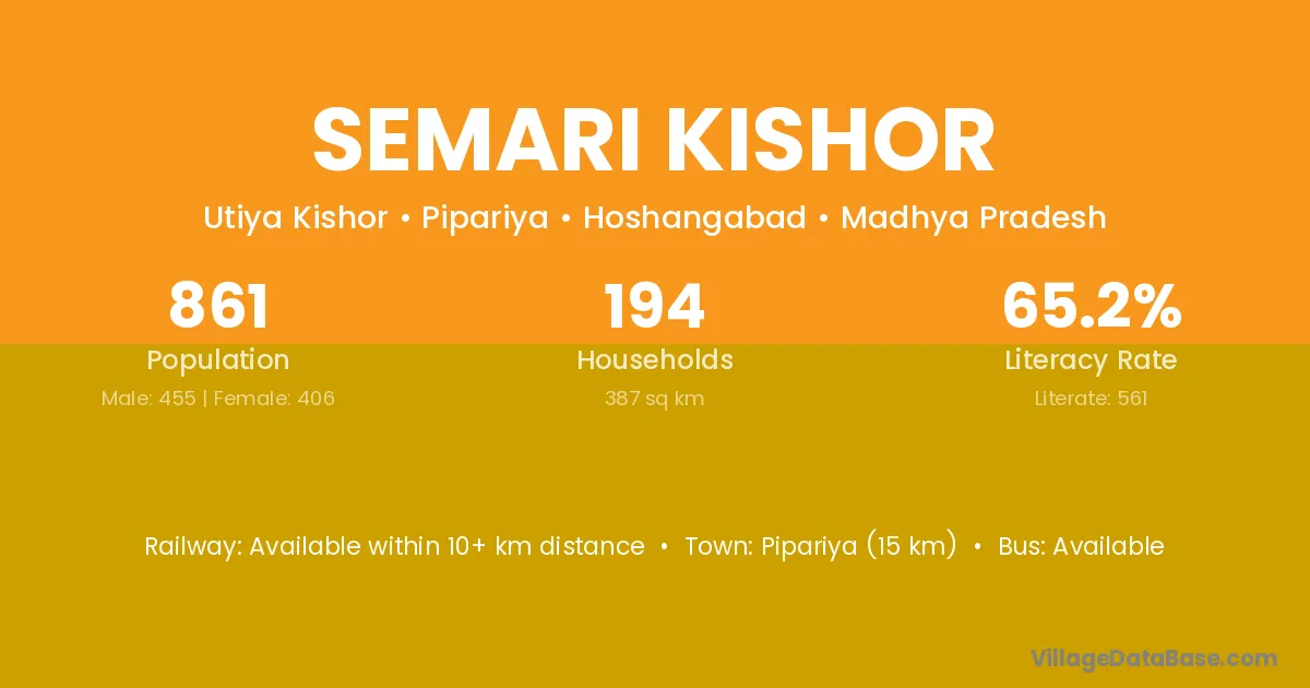 Pipariya (15 km) is the nearest town to Semari Kishor village for major economic activities and is located approximately 15 km away.