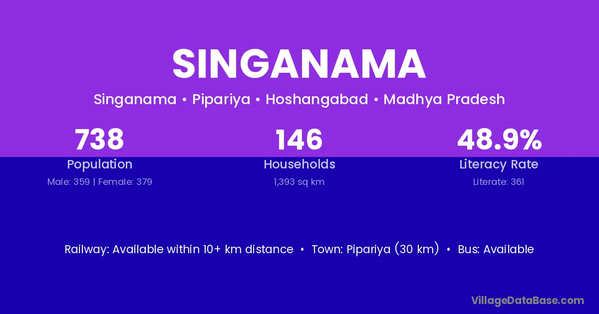 Pipariya (30 km) is the nearest town to Singanama village for major economic activities and is located approximately 30 km away.