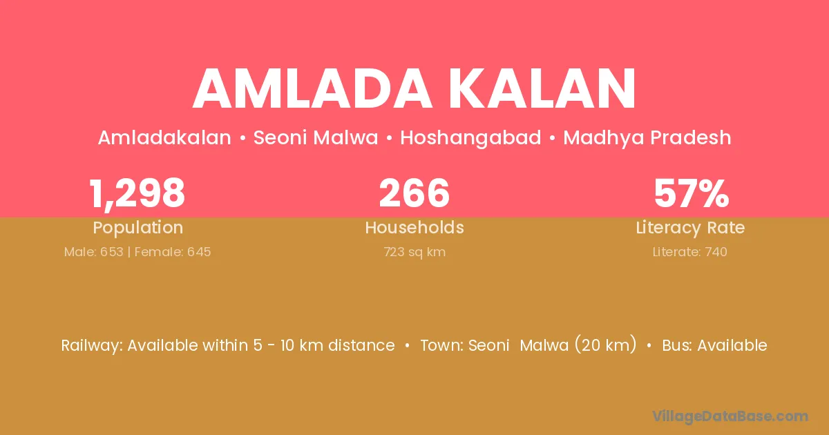 Amlada Kalan village has a total population of 1,298 people, of which 653 are males and 645 are females.