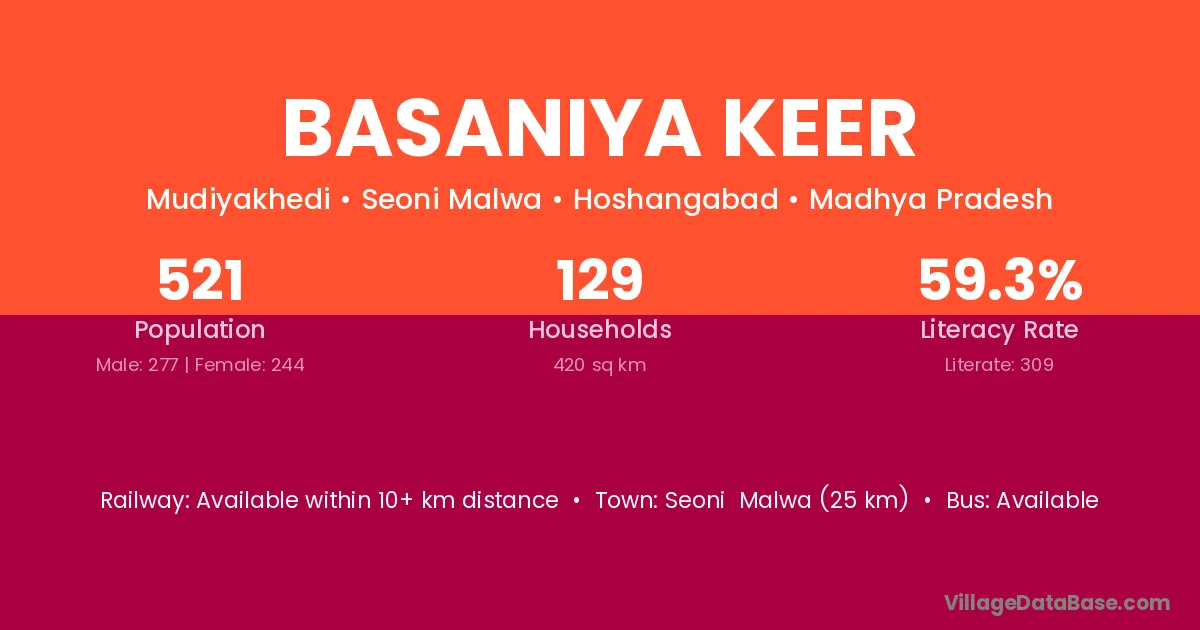 Seoni Malwa (25 km) is the nearest town to Basaniya Keer village for major economic activities and is located approximately 25 km away.