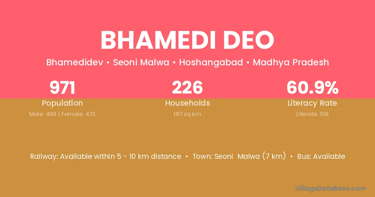 Seoni Malwa (7 km) is the nearest town to Bhamedi Deo village for major economic activities and is located approximately 7 km away.