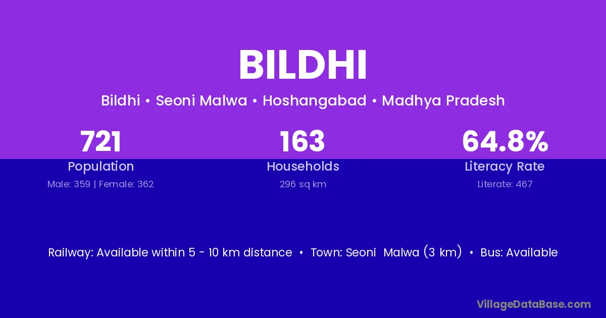 Seoni Malwa (3 km) is the nearest town to Bildhi village for major economic activities and is located approximately 3 km away.