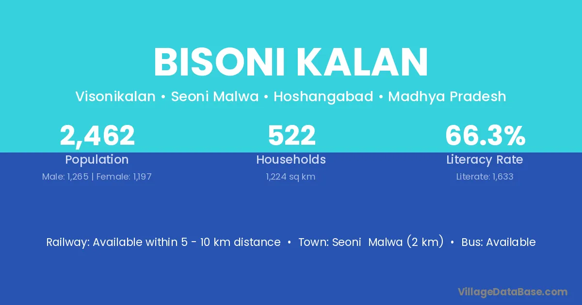 Seoni Malwa (2 km) is the nearest town to Bisoni Kalan village for major economic activities and is located approximately 2 km away.