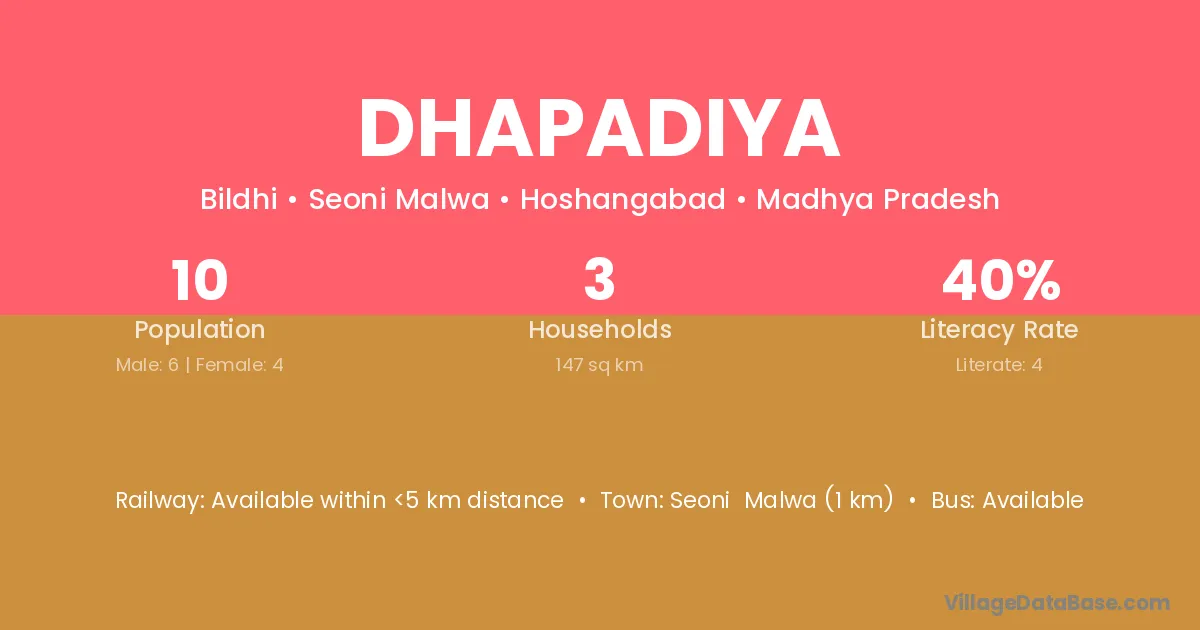 Seoni Malwa (1 km) is the nearest town to Dhapadiya village for major economic activities and is located approximately 1 km away.