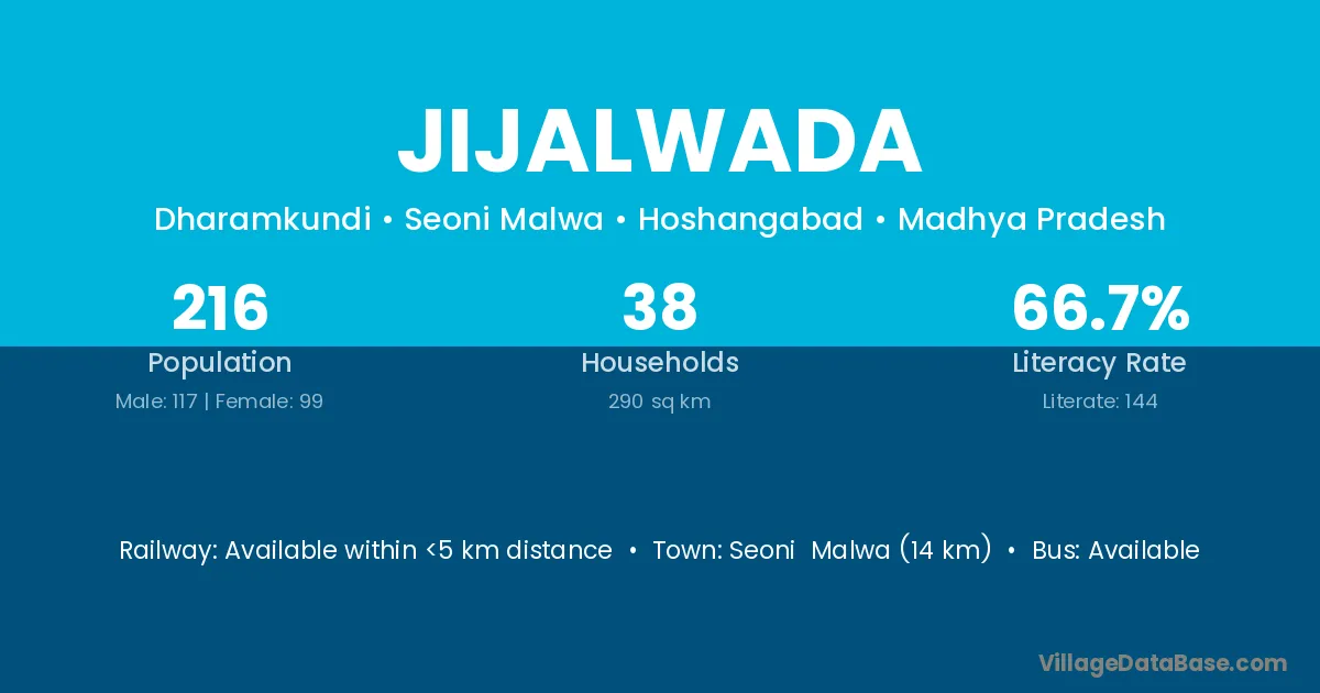 Seoni Malwa (14 km) is the nearest town to Jijalwada village for major economic activities and is located approximately 14 km away.