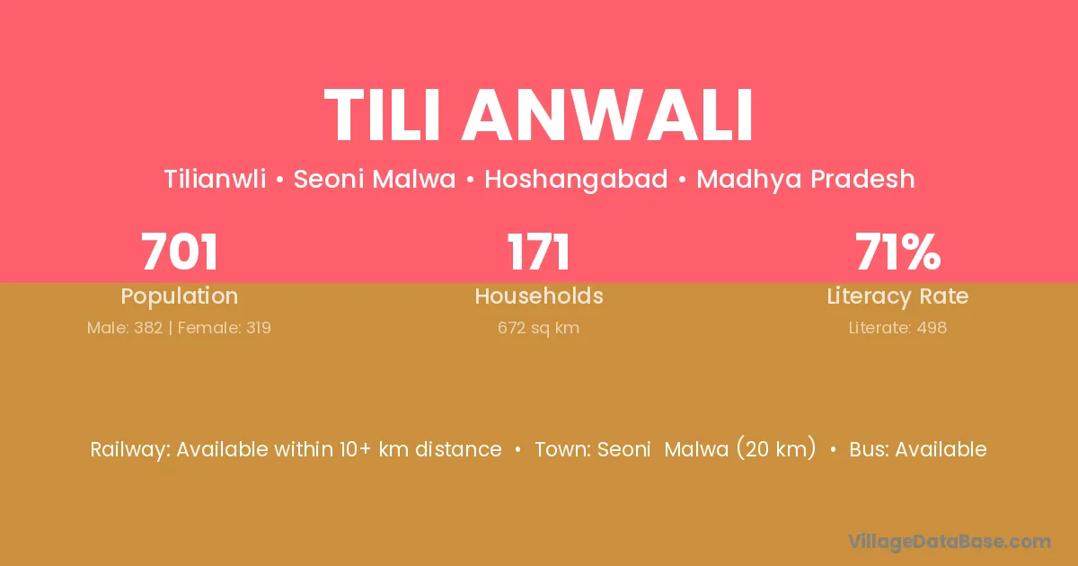 Seoni Malwa (20 km) is the nearest town to Tili Anwali village for major economic activities and is located approximately 20 km away.