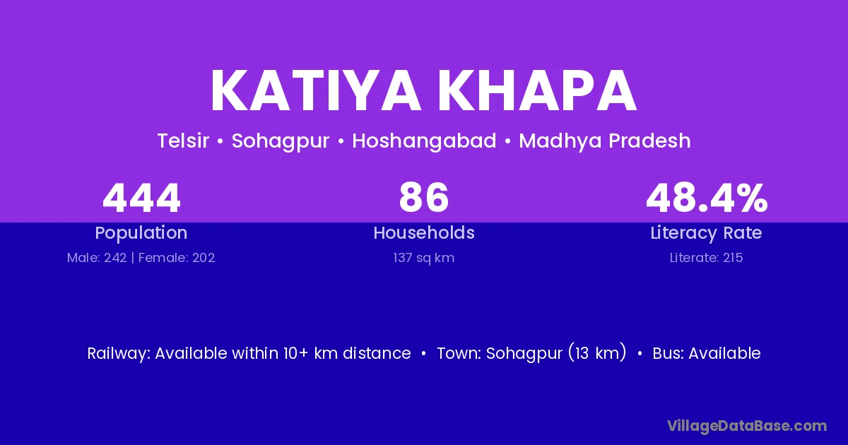 Sohagpur (13 km) is the nearest town to Katiya Khapa village for major economic activities and is located approximately 13 km away.