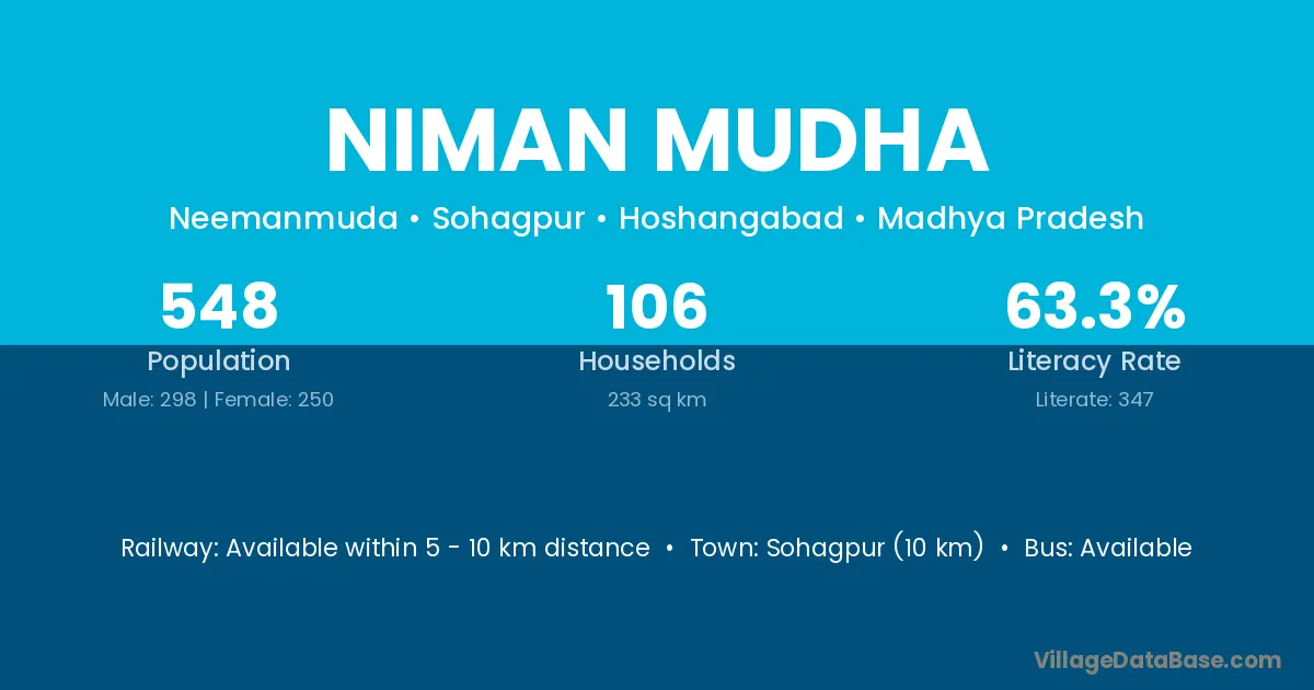 Sohagpur (10 km) is the nearest town to Niman Mudha village for major economic activities and is located approximately 10 km away.