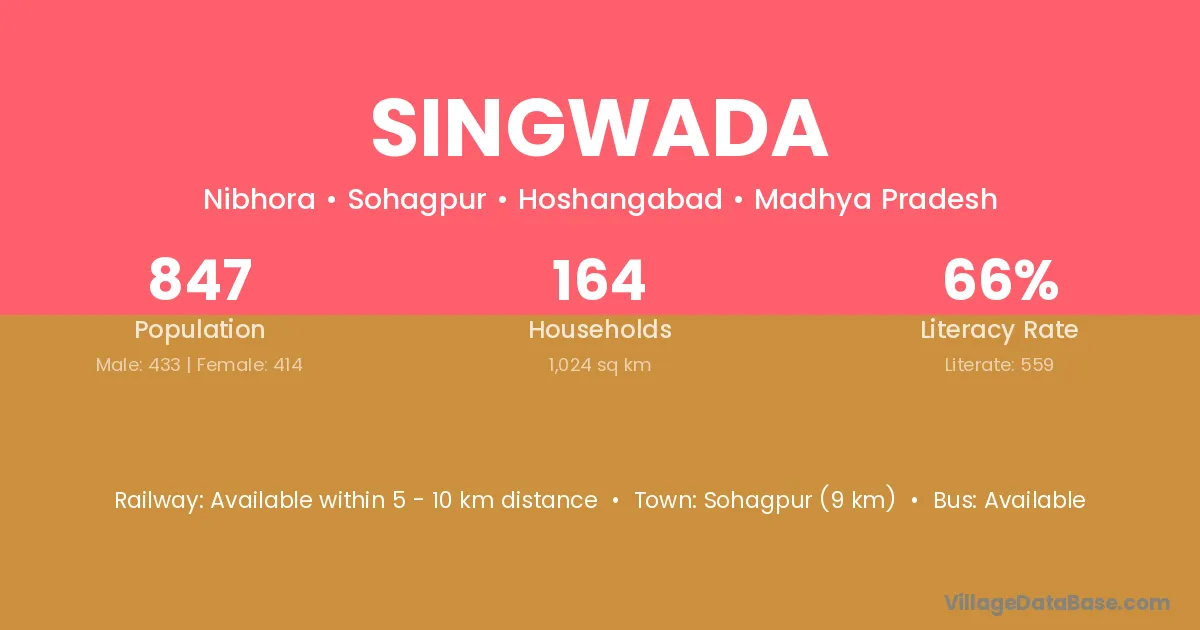 Sohagpur (9 km) is the nearest town to Singwada village for major economic activities and is located approximately 9 km away.