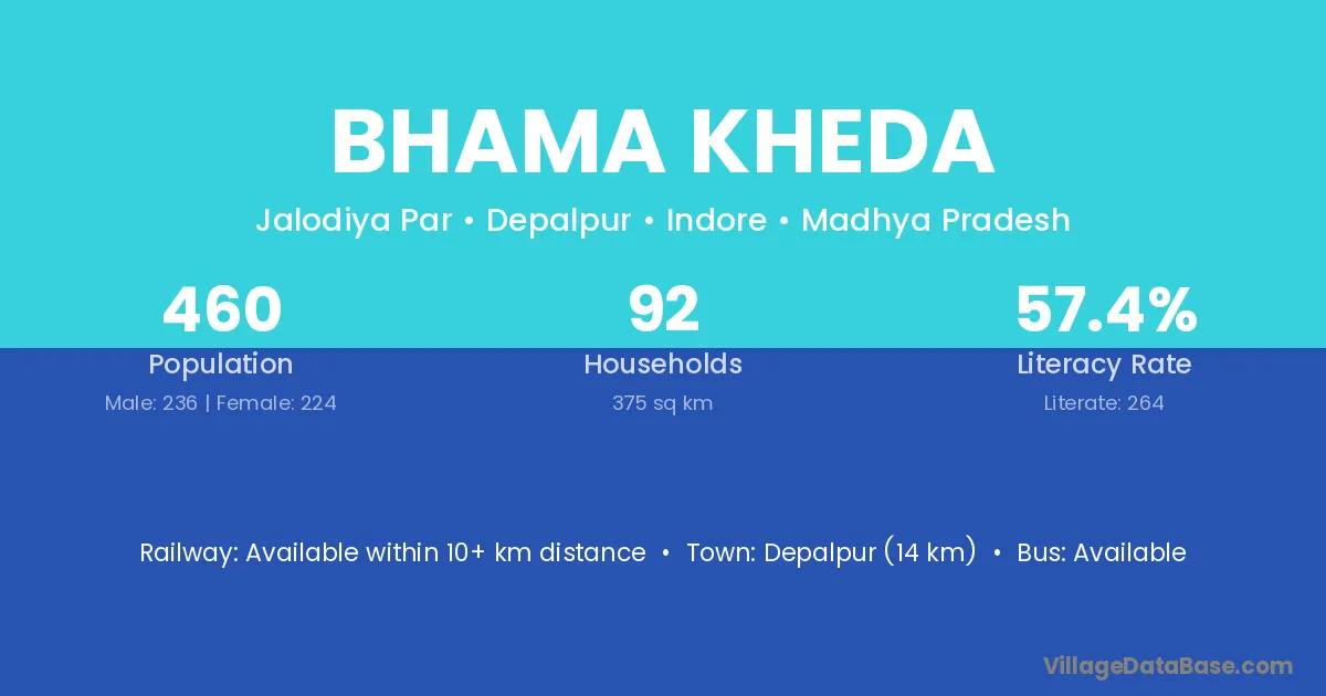 Bhama Kheda village has a total population of 460 people, of which 236 are males and 224 are females.