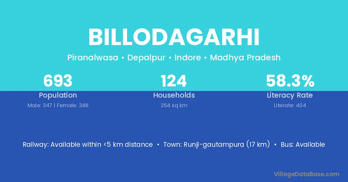 Runji-gautampura (17 km) is the nearest town to Billodagarhi village for major economic activities and is located approximately 17 km away.