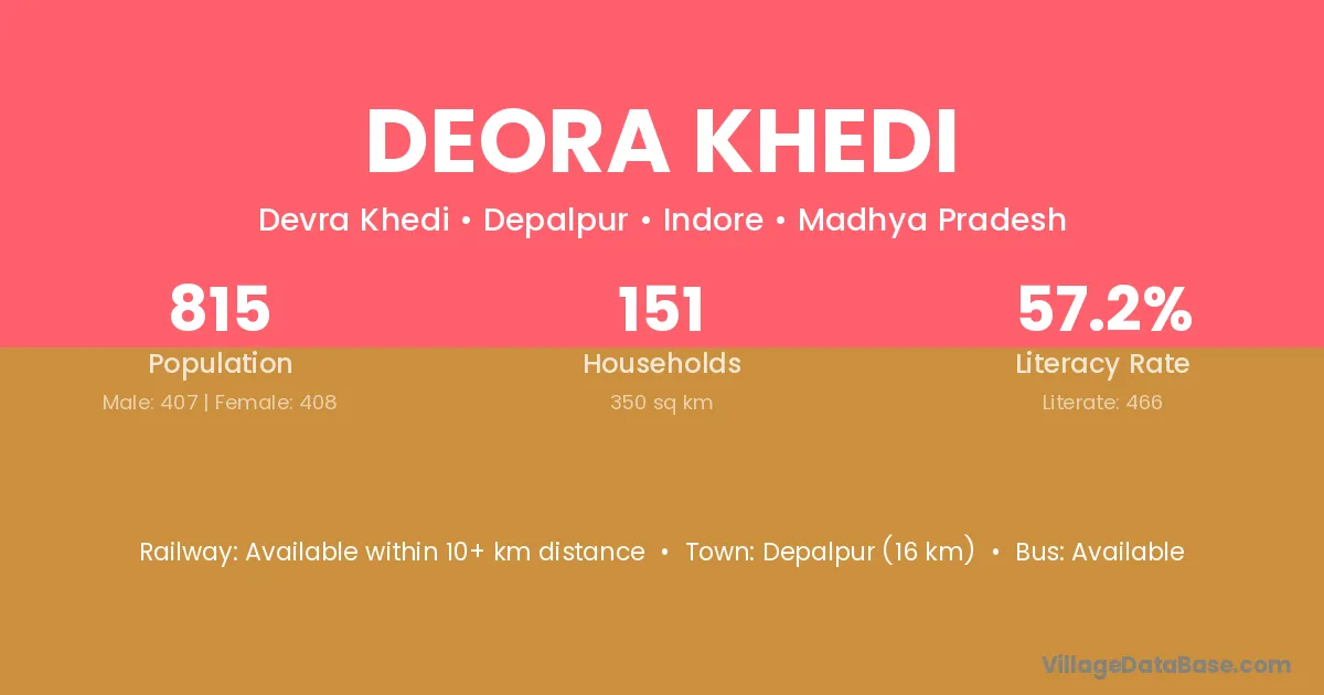Deora Khedi village has a total population of 815 people, of which 407 are males and 408 are females.