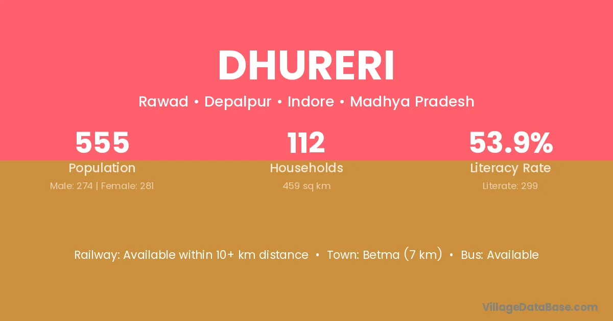 Betma (7 km) is the nearest town to Dhureri village for major economic activities and is located approximately 7 km away.