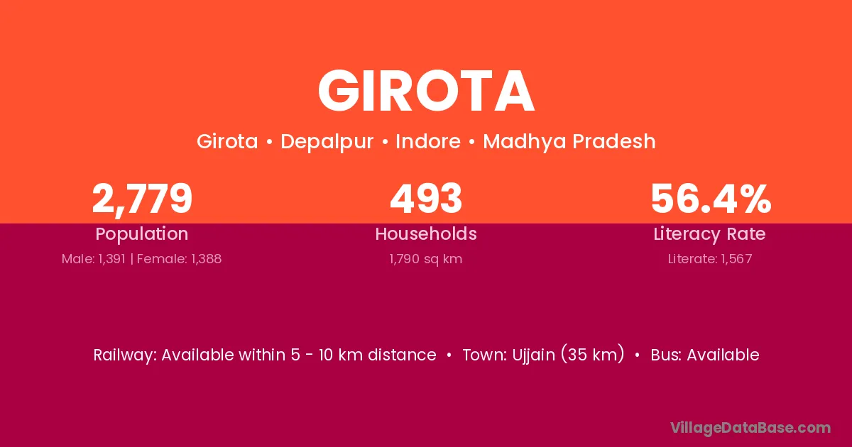 Ujjain (35 km) is the nearest town to Girota village for major economic activities and is located approximately 35 km away.