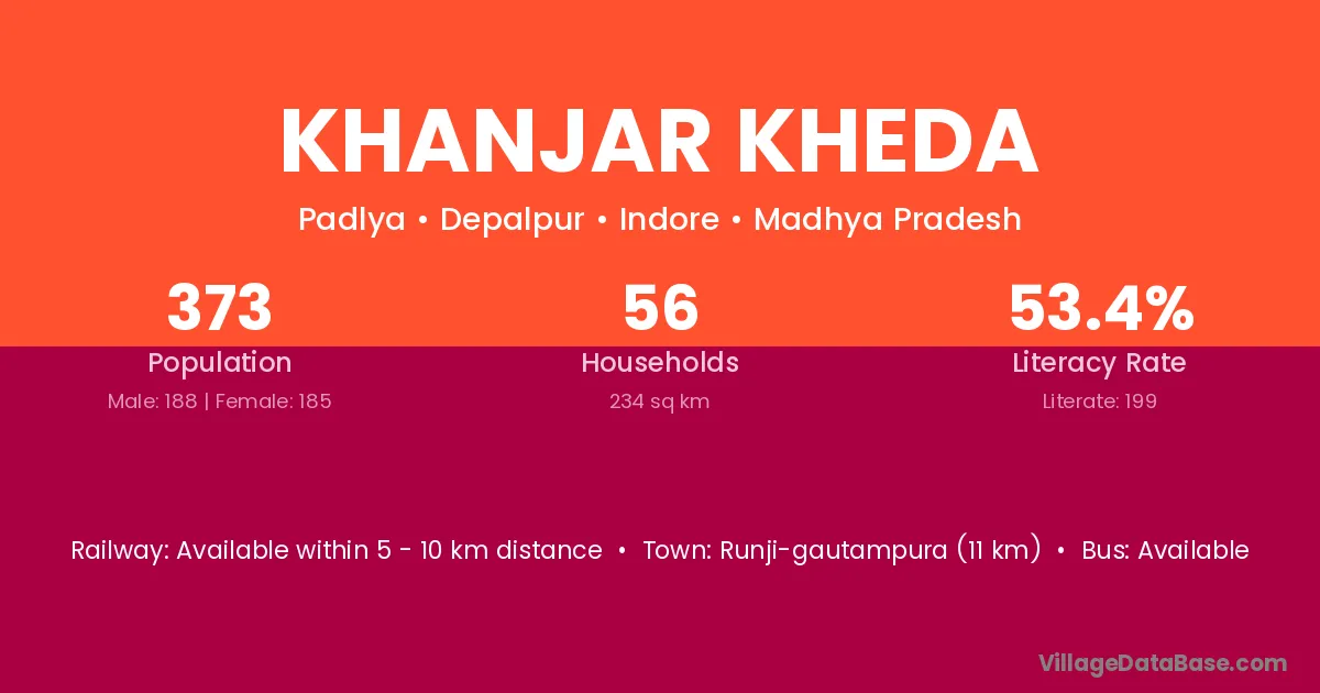 Khanjar Kheda village has a total population of 373 people, of which 188 are males and 185 are females.