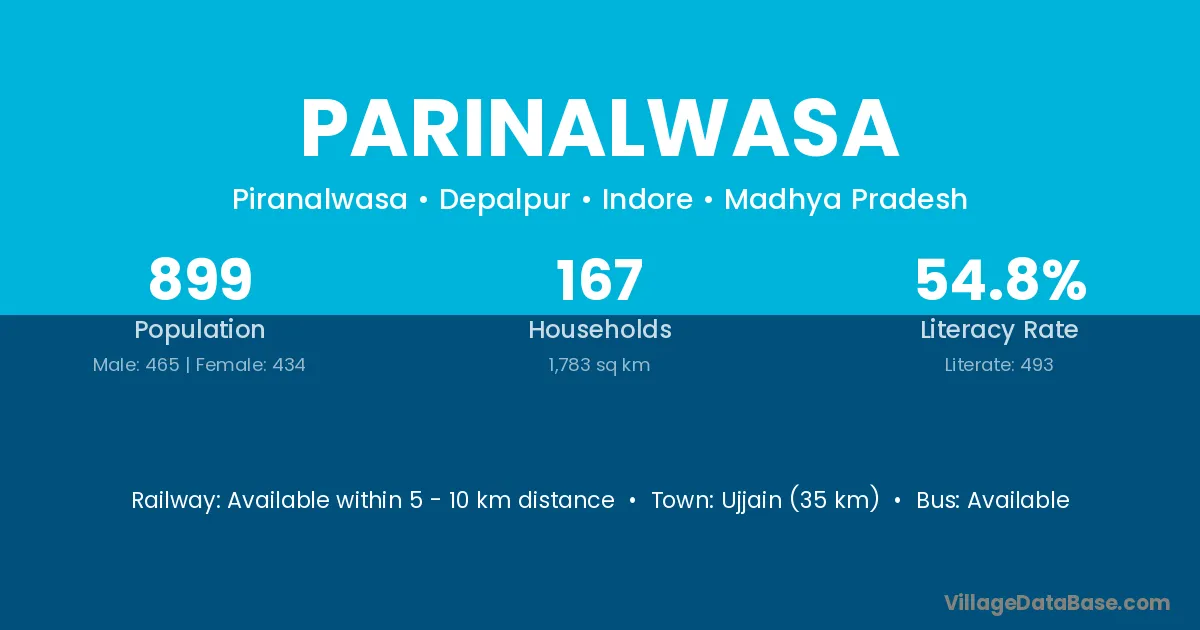 Ujjain (35 km) is the nearest town to Parinalwasa village for major economic activities and is located approximately 35 km away.