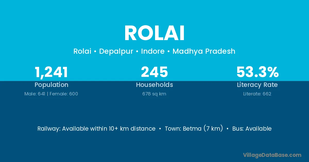 Rolai village has a total population of 1,241 people, of which 641 are males and 600 are females.