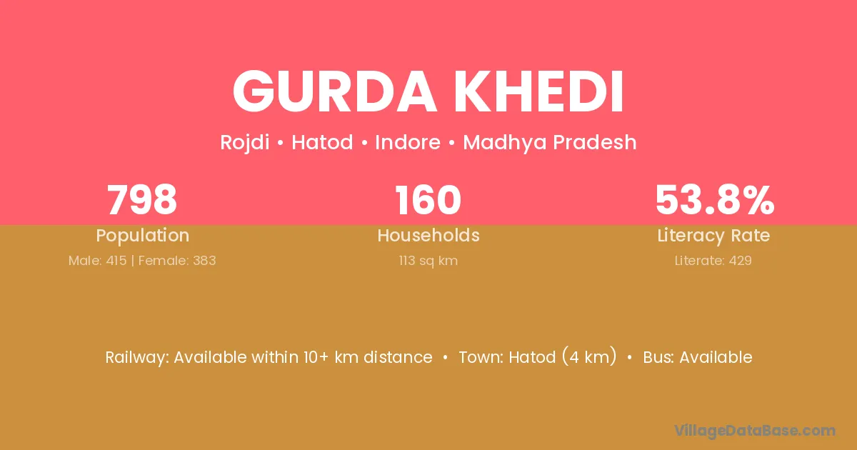 Hatod (4 km) is the nearest town to Gurda Khedi village for major economic activities and is located approximately 4 km away.