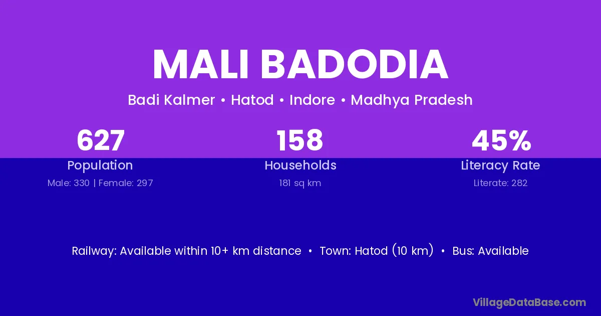 Hatod (10 km) is the nearest town to Mali Badodia village for major economic activities and is located approximately 10 km away.