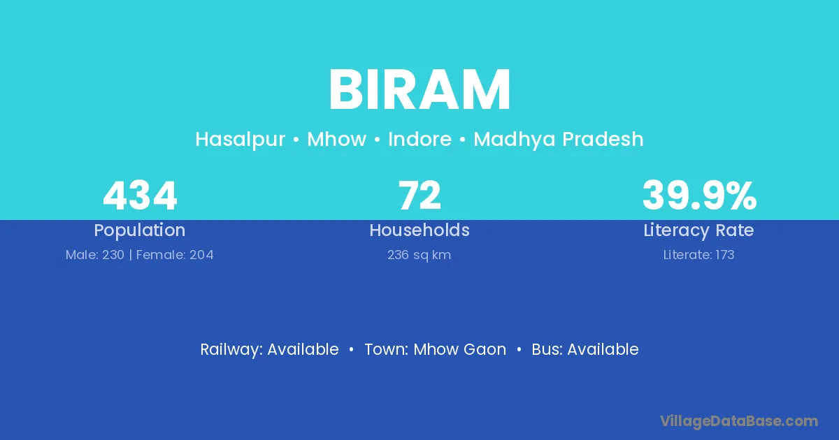Biram village has a total population of 434 people, of which 230 are males and 204 are females.