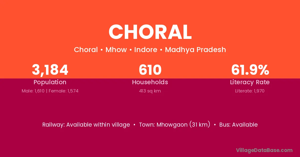 Mhowgaon (31 km) is the nearest town to Choral village for major economic activities and is located approximately 31 km away.