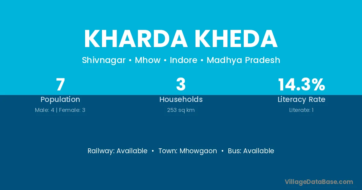 The literacy rate of Kharda Kheda village is 14.29%. Male literacy stands at 25.00% and female literacy at 0.00%.