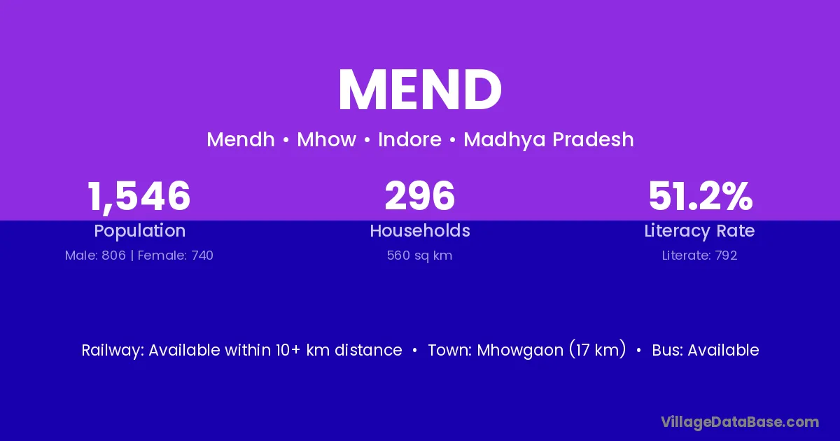 Mhowgaon (17 km) is the nearest town to Mend village for major economic activities and is located approximately 17 km away.