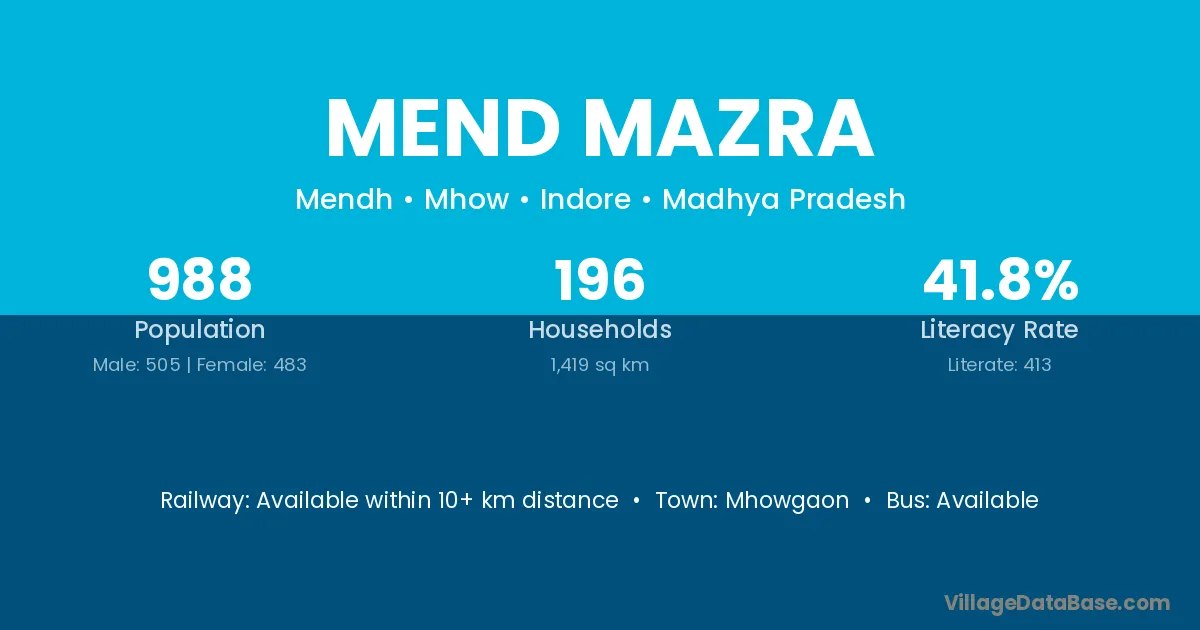 Mend Mazra village has a total population of 988 people, of which 505 are males and 483 are females.