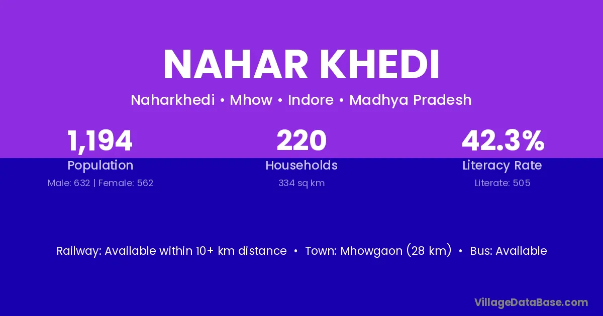 Mhowgaon (28 km) is the nearest town to Nahar Khedi village for major economic activities and is located approximately 28 km away.